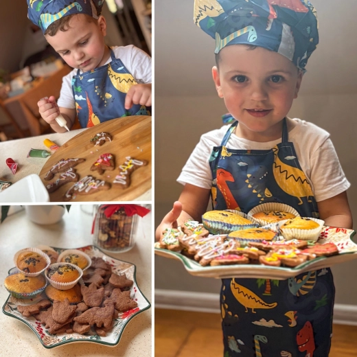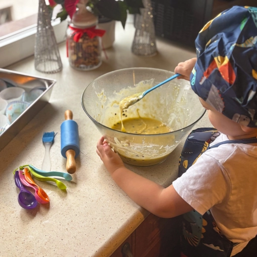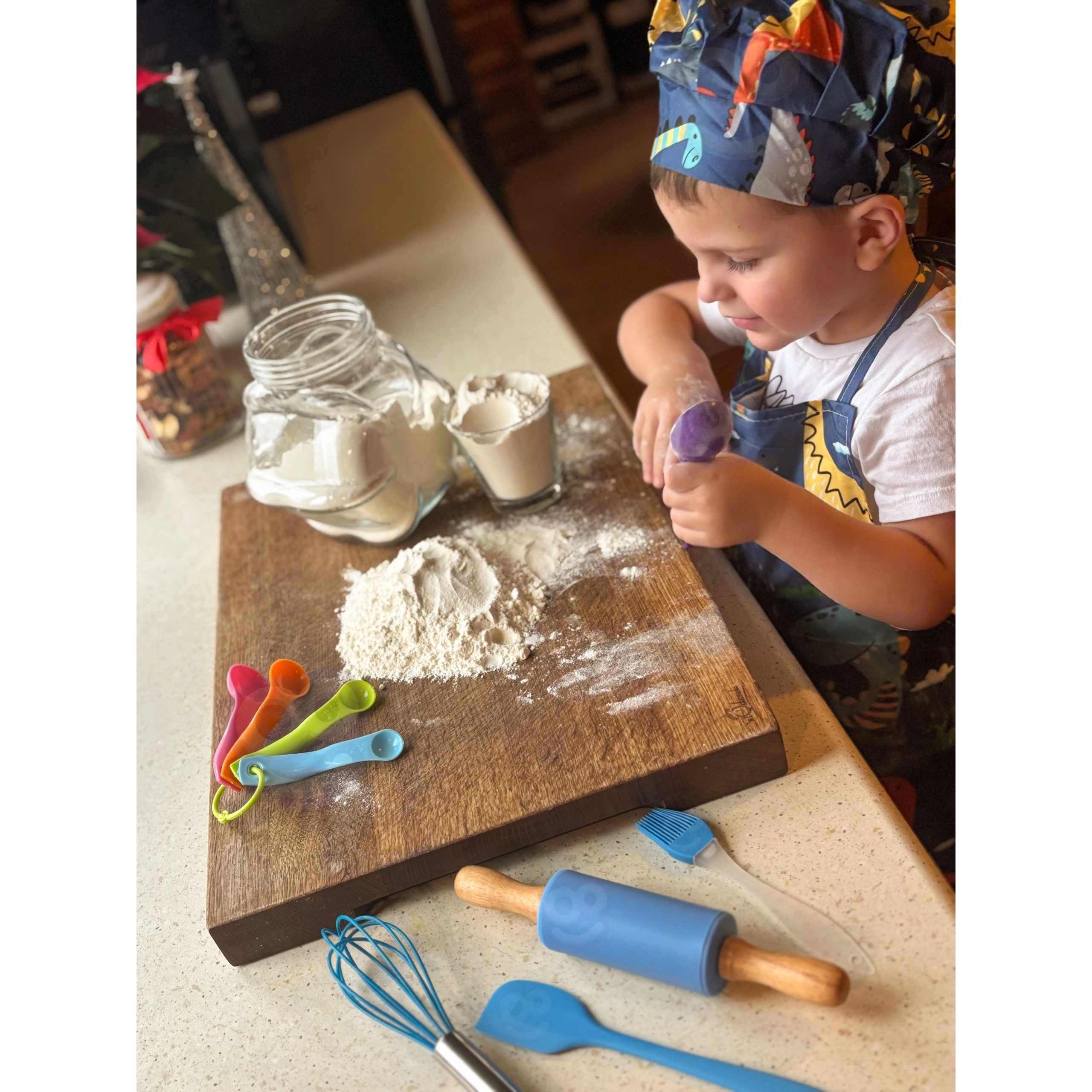 Im Set ist alles enthalten für Ausrollen, Rühren, Abmessen und Dekorieren – von Teigrolle und Schneebesen bis zu Silikonförmchen und Spritzbeuteln. Schürze und Mütze sind maschinenwaschbar, sodass der Spaß ohne Sorge um Schmutz weitergehen kann.