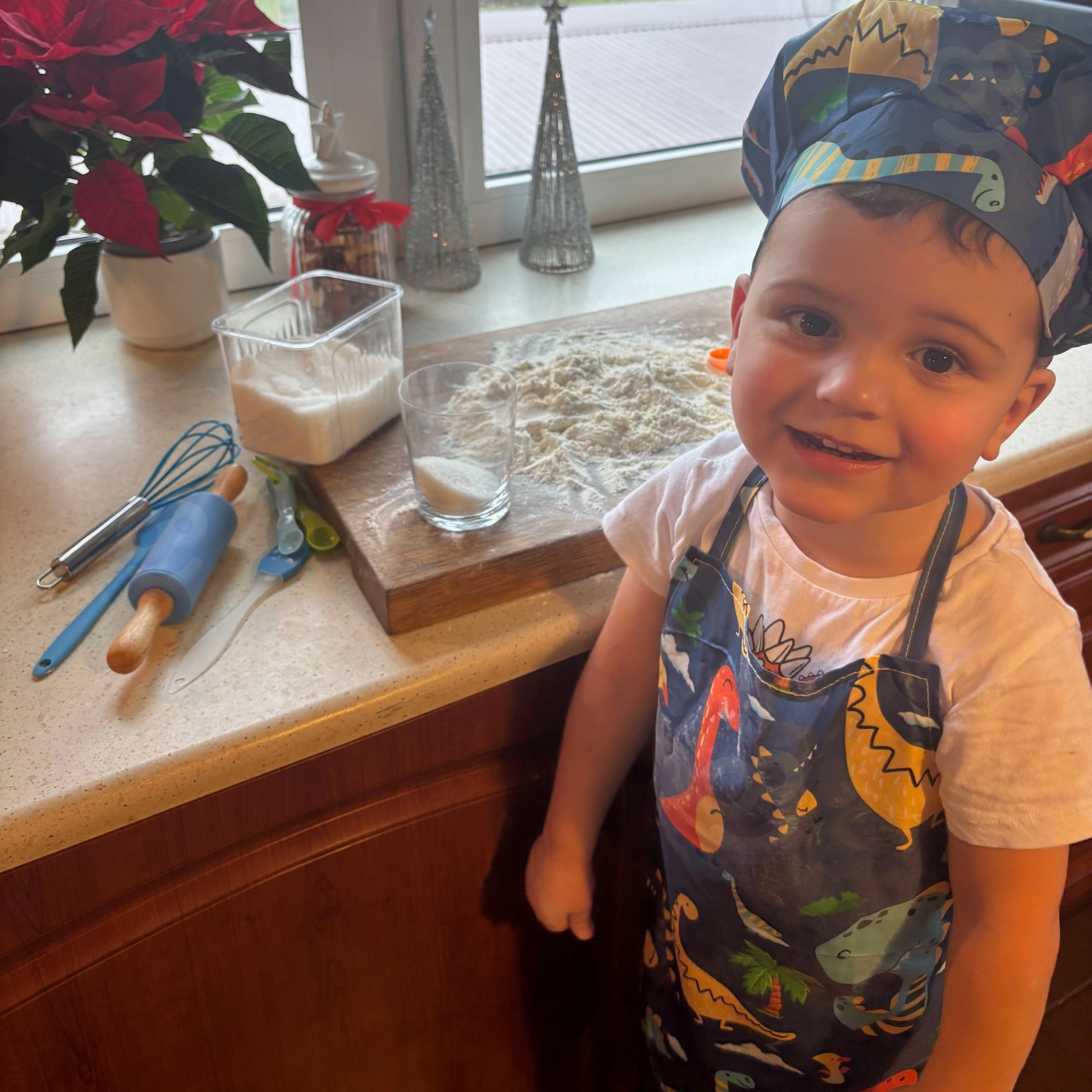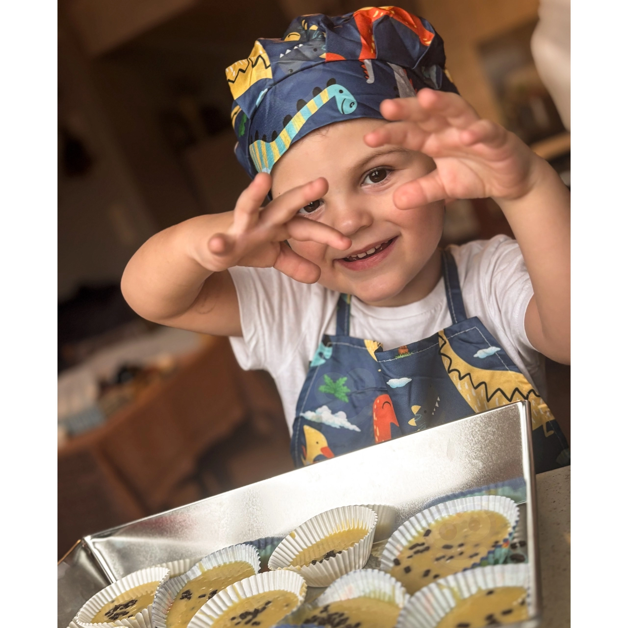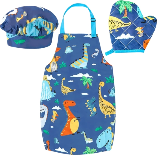 Das WOOPIE Kinderkochset für kleine Köche mit fröhlichem Dinosauriermuster ist ideal für die ersten Schritte in der Küche. Dank verstellbarem Schürzenband und elastischer Mütze sitzt alles perfekt; lebensmittelsichere Materialien und Silikonelemente sind robust und leicht abwaschbar. Das Set fördert Feinmotorik, Hand-Auge-Koordination und Kreativität beim gemeinsamen Kochen.