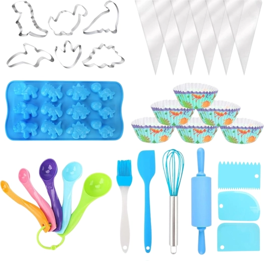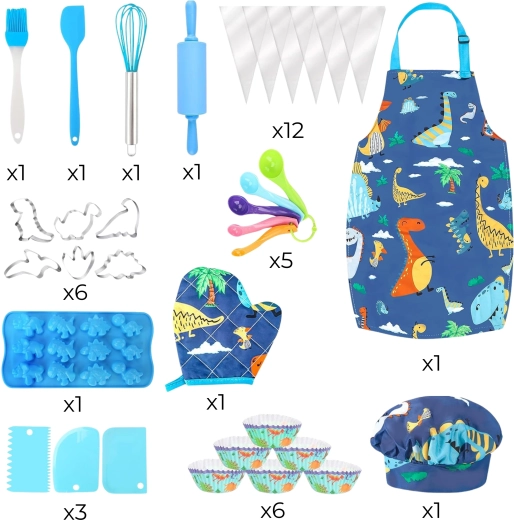 Alles, was Kinder zum Backen und Dekorieren brauchen: Teigrolle, Schneebesen, Spatel, Silikonpinsel, Messlöffel, Ausstechformen, Spritzbeutel, Förmchen, Teigschaber und eine Silikonform für Mini-Dinosaurier.