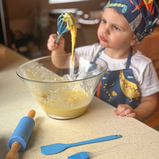 Leichte Werkzeuge aus lebensmittelsicheren Materialien, Silikonteile für einfache Reinigung und kinderfreundliche Maße für besseren Griff und Sicherheit bei der Arbeit.