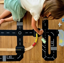 Die Straßenteile aus lebensmittelechtem Silikon sind weich, haftend und sehr widerstandsfähig – sie halten hervorragend auf verschiedenen Oberflächen, lassen sich leicht reinigen (auch im Geschirrspüler bis 50 °C) und ermöglichen ein schnelles und intuitives Zusammenbauen. Extra große Elemente erleichtern kleinen Kindern die Handhabung und fördern Motorik, Hand‑Augen‑Koordination sowie räumliche Vorstellungskraft.
