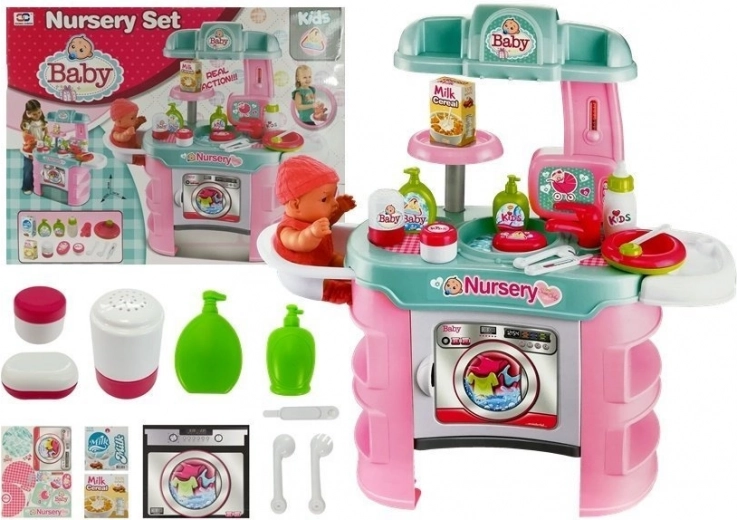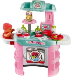 Dieses kreative Set ermöglicht es Kindern, ihre Lieblingspuppe wie ein echtes Baby zu versorgen. Sie können „Frühstück zubereiten“, „Kleidung waschen“ und spielerisch die Grundlagen der Pflege erlernen. Der Tisch mit Waschbecken und zu öffnender „Waschmaschine“ bietet eine stabile Basis für stundenlangen Spielspaß.