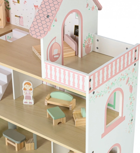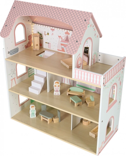 Die widerstandsfähige Konstruktion aus MDF-Platten, glatte Kanten und die stabile Ausführung gewährleisten sicheres Spielen. Das Haus ist 70 cm hoch und somit ideal für gemeinsames Spielen von Geschwistern. Öffnender Schrank, bewegliche Accessoires und zwei Holzfiguren fördern fantasievolle Geschichten und die Feinmotorik.