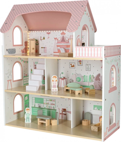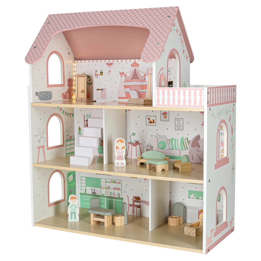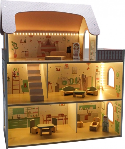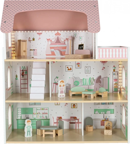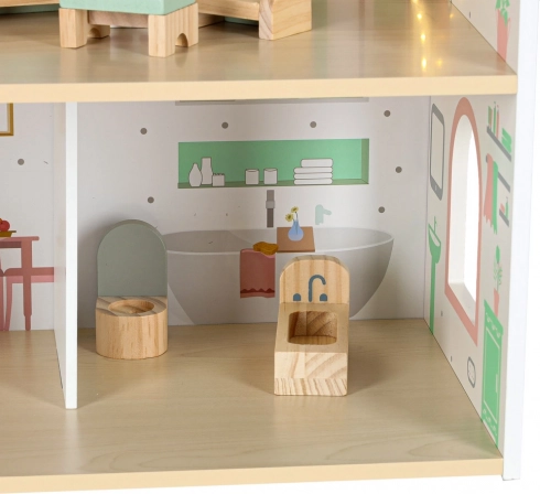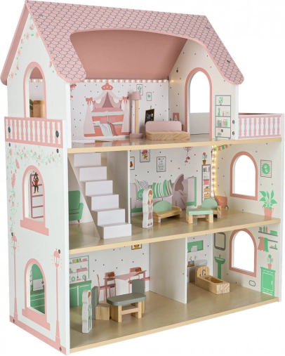 Das Puppenhaus Lulilo Peonio ist ein wunderschönes dreistöckiges Haus in Rosa-Mint-Kombination mit bedruckten Interieurs, Treppe und Balkon. Die warmen LED-Lichter sorgen abends für eine zauberhafte Stimmung und machen jedes Zimmer besonders gemütlich. Dank des umfangreichen Möbel-Sets richten Kinder Schlafzimmer, Wohnzimmer, Küche und Badezimmer im Handumdrehen ein.