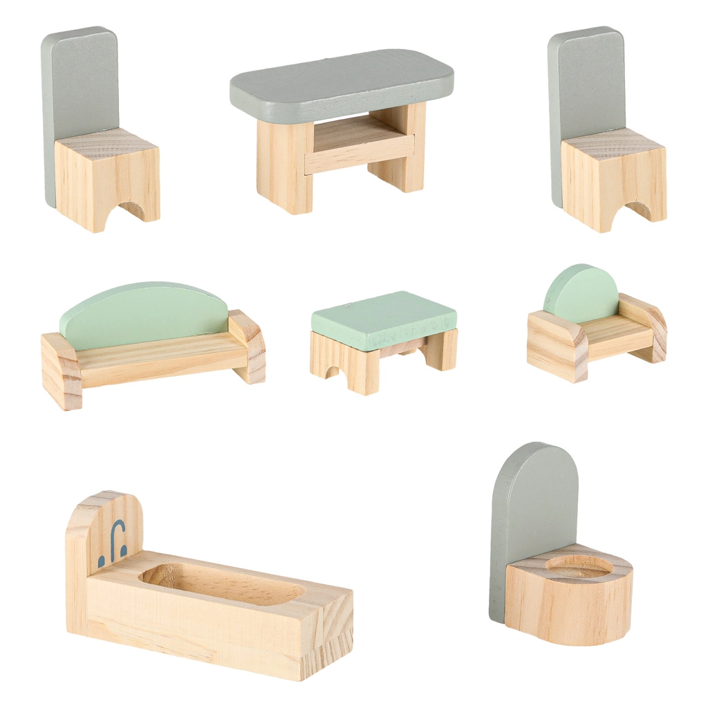 Mit dabei sind Bett, Schränkchen, Sitzgruppe, Tisch mit Stühlen sowie Badezimmereinrichtung. Zwei Holzfiguren regen Rollenspiel und Kreativität an.