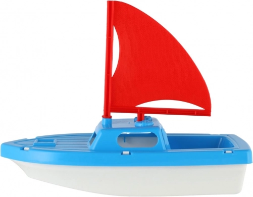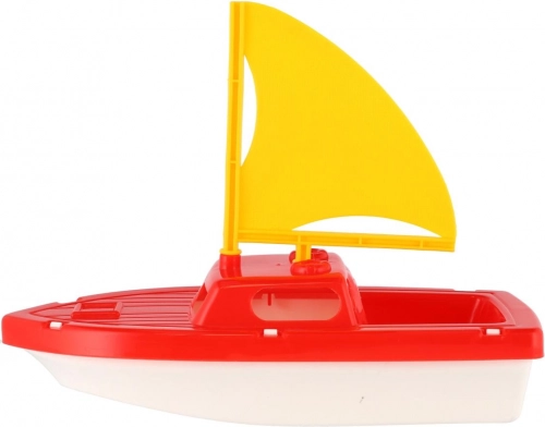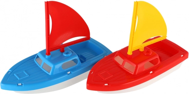 Wählen Sie zwischen Rot mit gelbem Segel und Blau mit rotem Segel – beide Farben sind kräftig und für Kinder attraktiv.