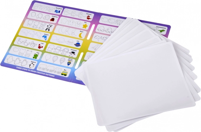 Enthalten sind ein angeschlossener Stylus/Pinsel, eine kompakte Basis zur einfachen Aufbewahrung sowie ein Set weißer Karten zum wiederholten Üben nach einfachen Vorlagen.