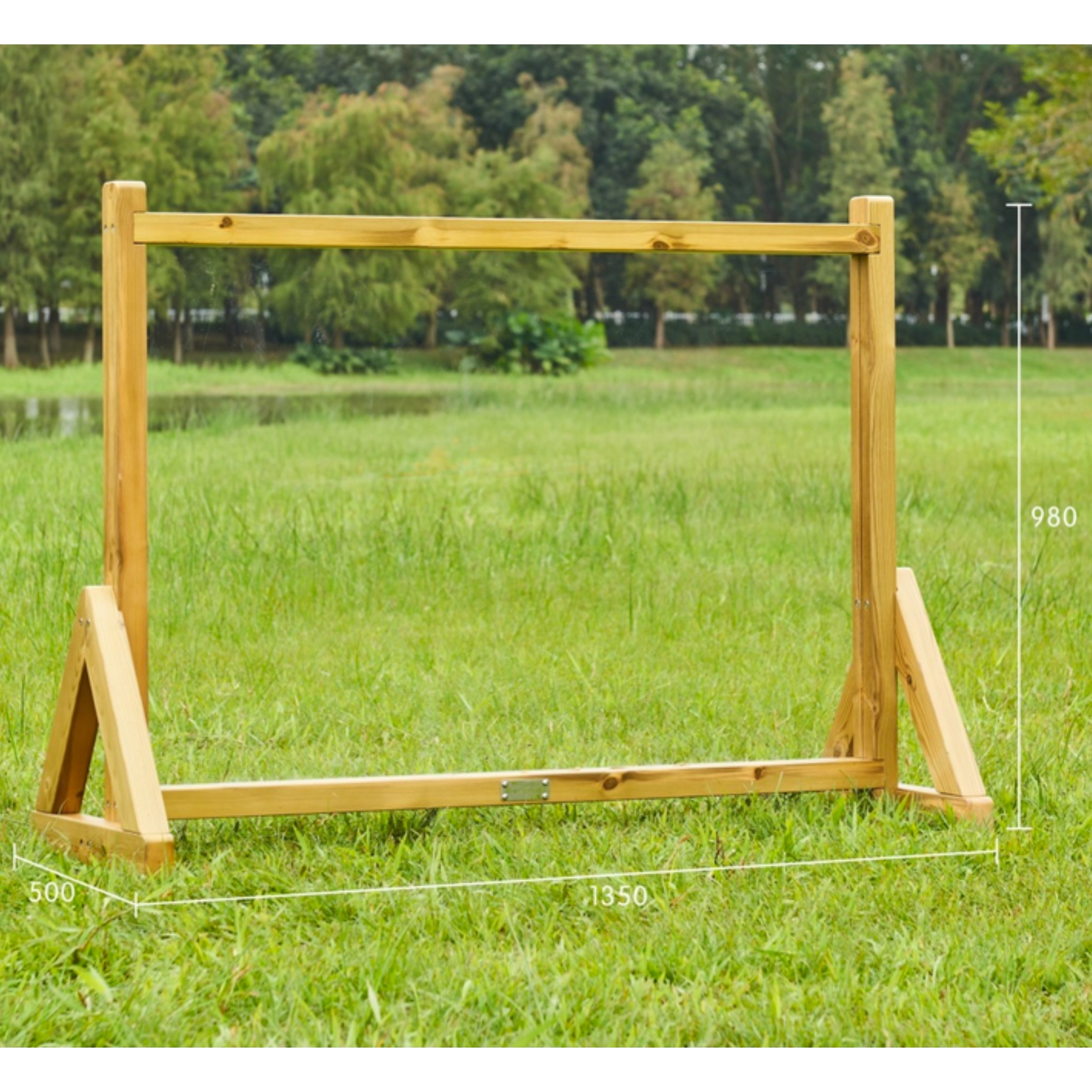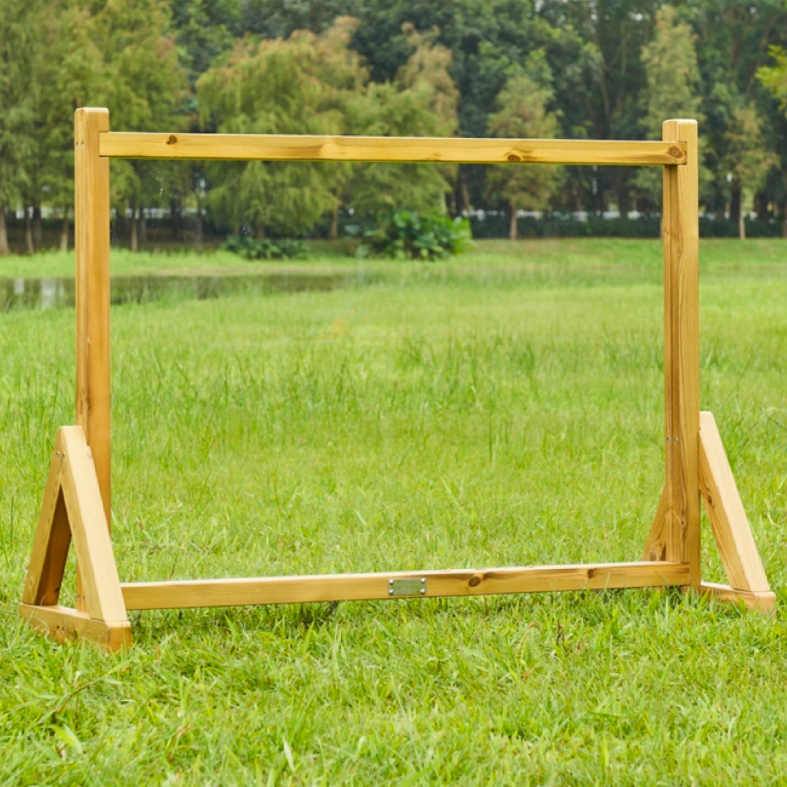 Der freistehende A-Rahmen mit Verstrebungen hält die Tafel auf Rasen wie auf festem Untergrund sicher an Ort und Stelle und ist sofort einsatzbereit.
