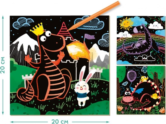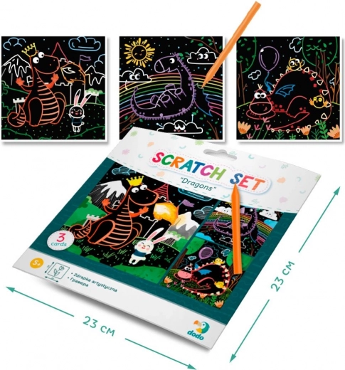 Kreativset DODO: 3 Kratzbilder mit Drachenmotiv 20 × 20 cm. Fördert Feinmotorik, Koordination und Kreativität. Inklusive Kratzwerkzeug.