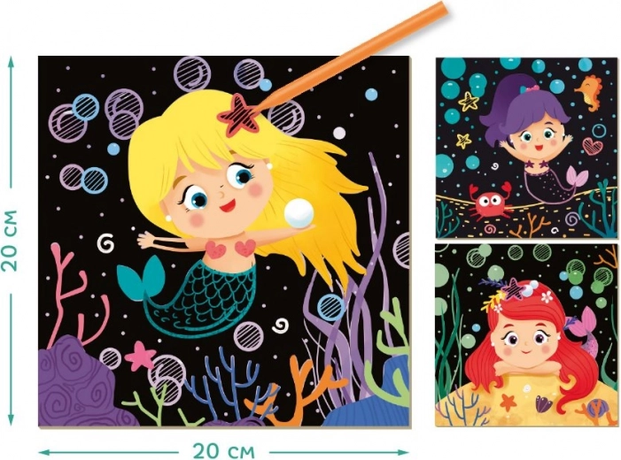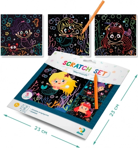 Das Set der DODO-Kratzbilder bietet Kindern Spaß und die Entwicklung von Fähigkeiten in einem. Dank der farbigen Unterschicht kommen beim Freikratzen nach und nach bunte Meerjungfrauenmotive zum Vorschein, die Kinder begeistern.