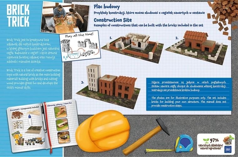 Werden Sie zum Baumeister und errichten Sie Schritt für Schritt eine realistische Baustelle aus natürlichen Lehmziegelchen. Jede Ziegel wird wie in Wirklichkeit gesetzt, die Leisten können Sie passgenau zuschneiden und dank des wasserlöslichen Klebers lässt sich das Modell jederzeit zerlegen und neu beginnen. Die fertige Konstruktion beleben Sie mit beiliegenden Dekorationen und Papierfiguren.