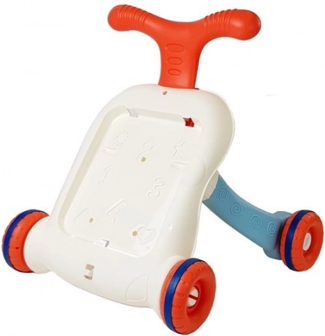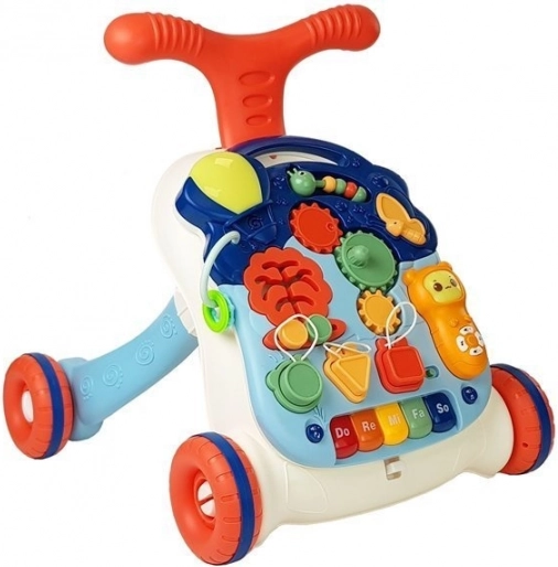 Die sichere und stabile Konstruktion unterstützt eine korrekte Gehhaltung. Die Hinterräder lassen sich blockieren und der Wagenkörper kann zur höheren Stabilität mit Wasser beschwert werden. Die umfangreiche Ausstattung mit Zahnrädern, Formelementen an Schnüren, Schiebereglern und einem abnehmbaren Telefon hält die Aufmerksamkeit und motiviert zum Entdecken.
