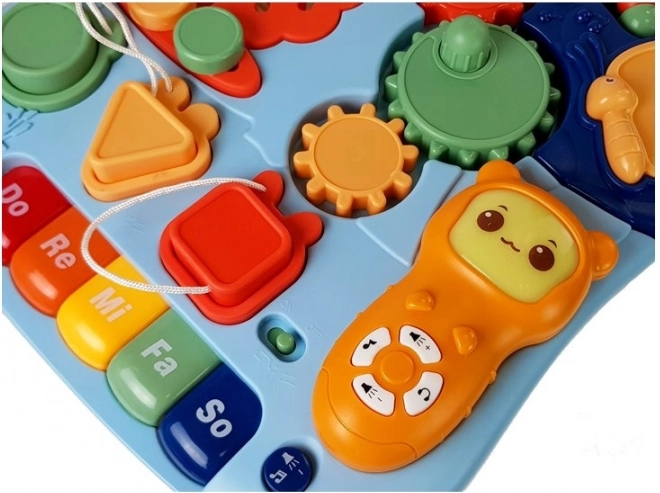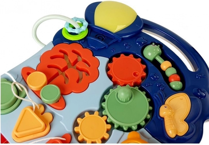 Drehbare Zahnräder, Schieberegler, Formen an Schnüren und drückbare Tasten trainieren Greifen, Auge-Hand-Koordination und logisches Denken.