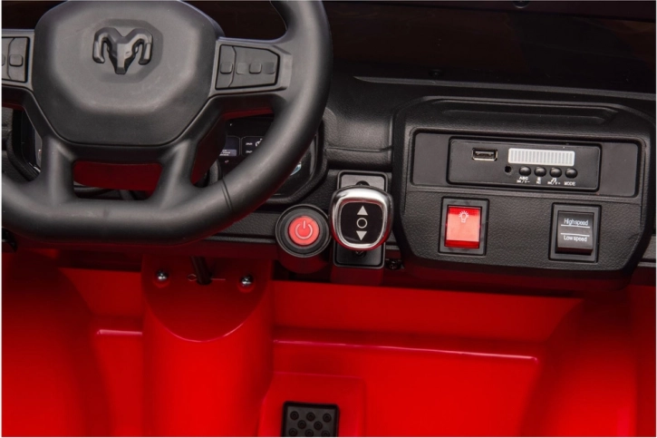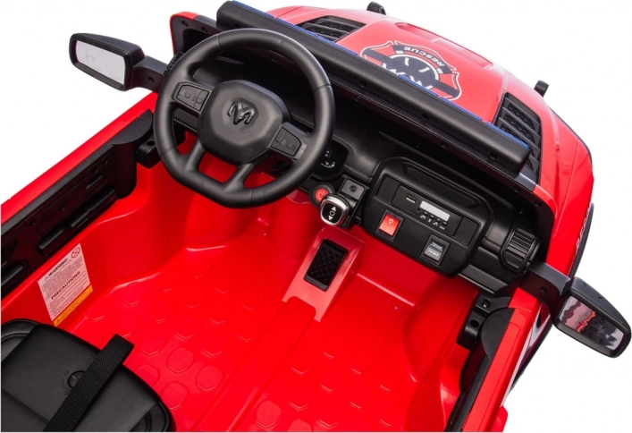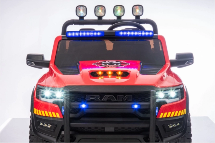 Der stylische rote Pick-up im RAM-Stil ist ideal für kleine Feuerwehr-Fans. Die Zweisitz-Ausführung mit Sicherheitsgurten, ein realistisches Cockpit mit Lenkrad, Pedal und Medienpanel sowie markante LED-Leisten auf dem Dach machen jede Fahrt zu einer spannenden Rettungsaktion. Große profilierte Räder und der vordere Schutzrahmen gewährleisten eine stabile Fahrt und einen robusten Look.