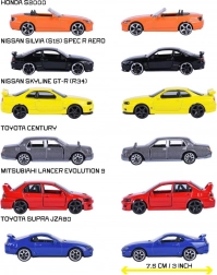 Dank öffnender Teile (z. B. Türen, Motorhaube oder Kofferraum) und freilaufender Räder eignen sich die Autos perfekt zum Spielen und als Sammlerstücke. In der Verpackung kann eines der beliebten Modelle der Marken NISSAN, MITSUBISHI, TOYOTA oder HONDA in der limitierten Japan-Serie enthalten sein.