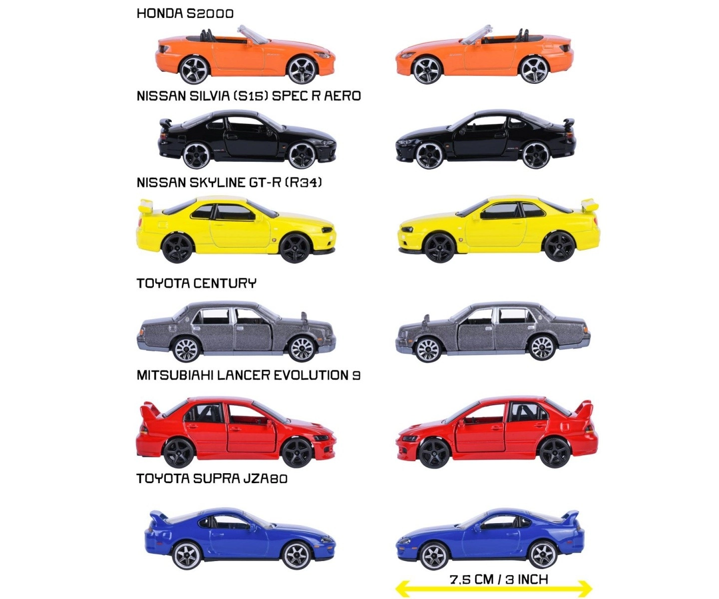 Entdecken Sie ikonische japanische Fahrzeuge in der Edition Majorette Japan Legends Premium. Metallmodelle im Maßstab 1:64 mit detailreicher Ausführung, öffnenden Teilen und freilaufenden Rädern begeistern kleine und große Fans der Marken NISSAN, MITSUBISHI, TOYOTA und HONDA. Länge ca. 7,5 cm. Verschiedene Varianten – wir liefern nach dem Zufallsprinzip, Preis pro 1 Stück.