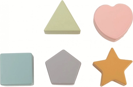 Fünf Einlegeformen in ansprechenden Farben helfen Kindern, Formen und Farben zu erkennen und trainieren zugleich einen präzisen Griff sowie das räumliche Wahrnehmen.