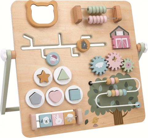 Drehbare Zahnräder, Schiebeelemente, ein Draht- und Perlenlabyrinth sowie ein Abakus unterstützen die Feinmotorik, die Hand-Auge-Koordination und das logische Denken beim Spielen.