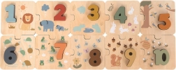 Das Holz-Rechenpuzzle mit Tieren verbindet Lernen mit Spielen. Jedes quadratische Teil aus Naturholz zeigt eine Zahl und die gleiche Anzahl niedlicher Motive – zum Beispiel 9 Eicheln mit einem Eichhörnchen, 8 Schmetterlinge mit einem Blümchen und 7 Fröschchen. So verinnerlichen Kinder spielerisch das Erkennen von Zahlen und die Grundlagen des Zählens.