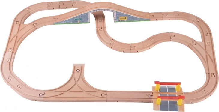 Verschiedene Schienenformen mit Brücke, Kurven und Kreuzungen halten die Aufmerksamkeit der Kinder und fördern räumliches Vorstellungsvermögen sowie Routenplanung.