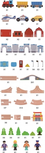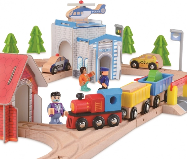 Diese detailreich gestaltete Eisenbahn bietet eine komplette Welt auf Schienen: Lokomotive mit Waggons, Autos, Figuren, Polizeistation, Landeplatz, Bäume und Verkehrsschilder. Kinder können Fracht verladen, über die erhöhte Brücke fahren, am Bahnhof halten und den Bahnübergang mit Schranken sicher passieren. Jede Fahrt wird zu einer neuen Geschichte und fördert Logik, Hand-Auge-Koordination und Kommunikation beim gemeinsamen Spiel.