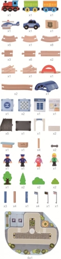Diese moderne Holz-Eisenbahn mit dem Motiv der geschäftigen Stadt bietet Kindern alles, was sie für viele Stunden fantasievollen Spiels brauchen. Das Set enthält einen blauen Zug mit drei Waggons, vielfältige Gleise einschließlich einer erhöhten Überführung und einen geräumigen Bahnhof mit Überdachung. Nicht fehlen dürfen ein Polizeiauto, Figuren, Verkehrszeichen, Lampen, Bäume und weiteres Zubehör, das die Atmosphäre einer echten Stadt schafft.