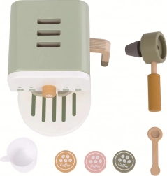 Hochwertige Materialien (Naturholz, MDF und Sperrholz) und angenehme Pastellfarben sorgen dafür, dass die Maschine wunderbar ins Kinderzimmer passt. Das Set enthält alles, was für die „Zubereitung“ von Kaffee nötig ist, und inspiriert zu Rollenspielen, die Kommunikation und Fantasie fördern.