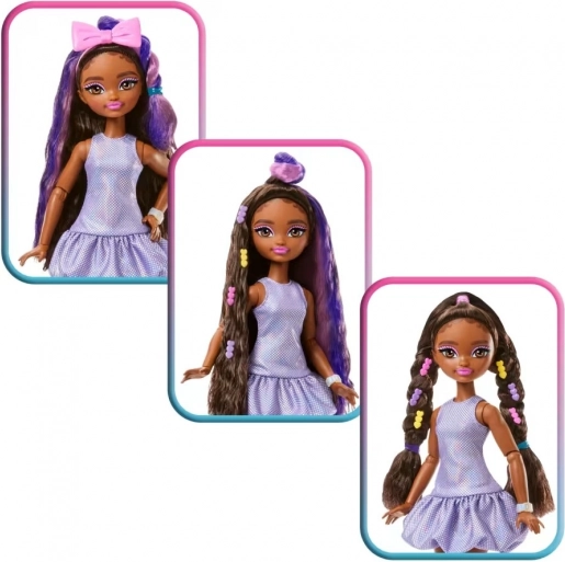 Öffnende Döschen in Lockenwickler-Form verbergen süße Überraschungen fürs Haarstyling, darunter farbige Kreide und eine große Schleife. Dank des langen, dichten Haars und der Gelenke zum Posieren erlebt ihr unzählige Mode- und Foto-Szenarien mit „Telefon“, „Ringlicht“, Spiegel und weiteren Details.
