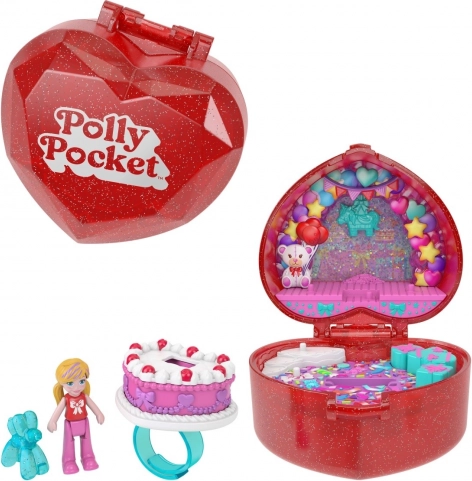 Polly Pocket Jubiläums-Kompaktset zum 80. Jubiläum von Mattel: glitzerndes Herz, Mikropuppe, Ring mit Torte und Party-Zubehör. Ideal als Reisegeschenk.