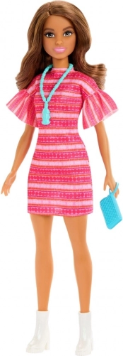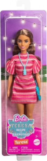 Die Teresa-Puppe sieht genau aus wie im Film BARBIE & TERESA: Rezept für Freundschaft – mit rosafarbenem, gemustertem Kleid mit Rüschenärmeln, weißen Schuhen und markanten türkisfarbenen Accessoires. Dank der detailreichen Verarbeitung von Outfit und Make-up ist sie bereit für jedes Modeabenteuer.