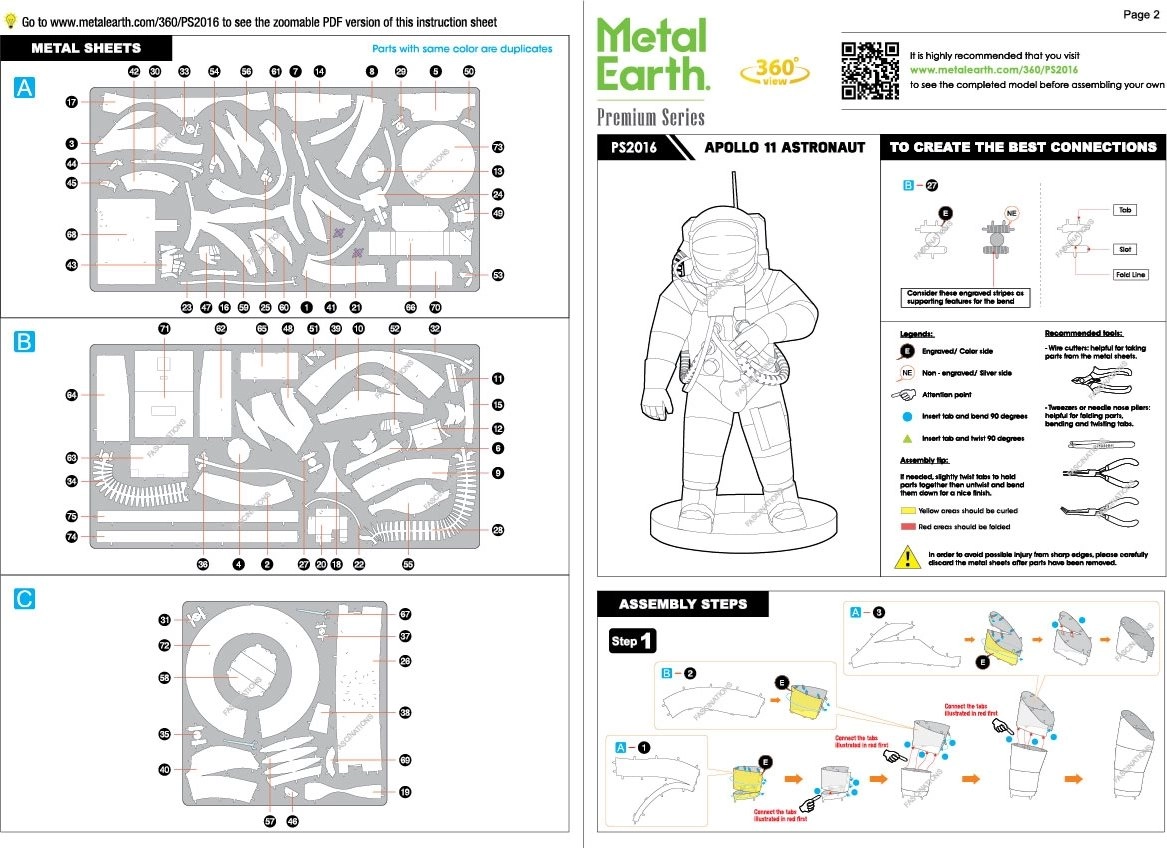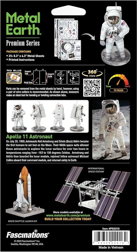Entdecken Sie die Freude an präzisem Metallmodellbau mit der Premium-Serie von METAL EARTH. Aus flachen, quadratischen Stahlblechen setzen Sie eine realistische Miniatur des Apollo-11-Astronauten mit feiner Lasergravur zusammen, die jedes Detail des Raumanzugs hervorhebt.