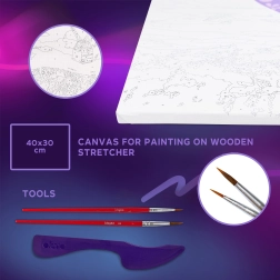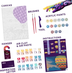 Alles Nötige ist im Set enthalten: hochwertige Leinwand mit vorgedruckter Vorlage, selbsthärtende Modelliermasse für plastische Teile des Ballons, Farben und Pinsel, ein praktisches Modellierwerkzeug sowie eine bebilderte Schritt‑für‑Schritt‑Anleitung. Dank klar gekennzeichneter Zahlen ist der Ablauf auch für leicht Fortgeschrittene intuitiv.