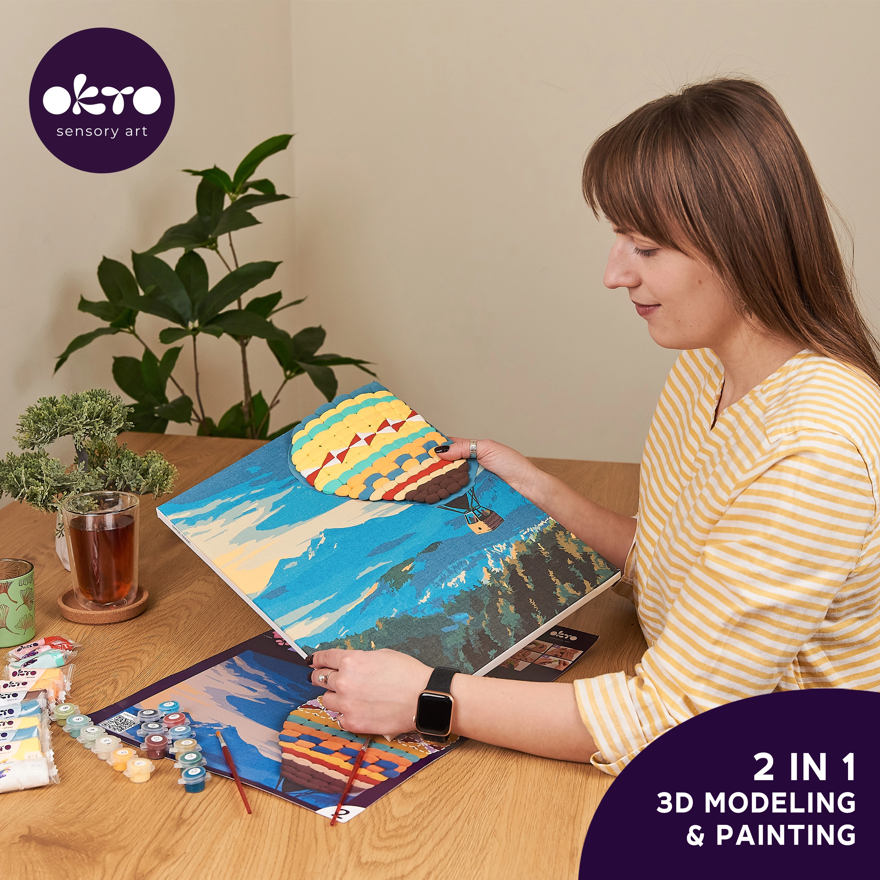 Entdecken Sie die Freude am Gestalten mit dem originellen Bild OKTO Hot Air Balloon Flight. Die Verbindung aus Malen nach Zahlen und dem Formen von 3D‑Elementen garantiert ein einzigartiges visuelles Ergebnis, das in jedem Interieur hervorsticht. Ideal für kreative Entspannung, die Förderung der Feinmotorik und als Geschenk.