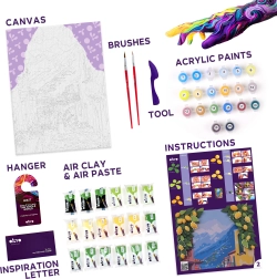 Im Paket ist alles enthalten, was Sie zum Gestalten brauchen – vom vorgedruckten Leinwandtuch über Farben bis hin zu Modelliermasse und Werkzeugen. Der Ablauf ist einfach und auch für absolute Anfänger gut geeignet.