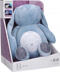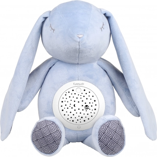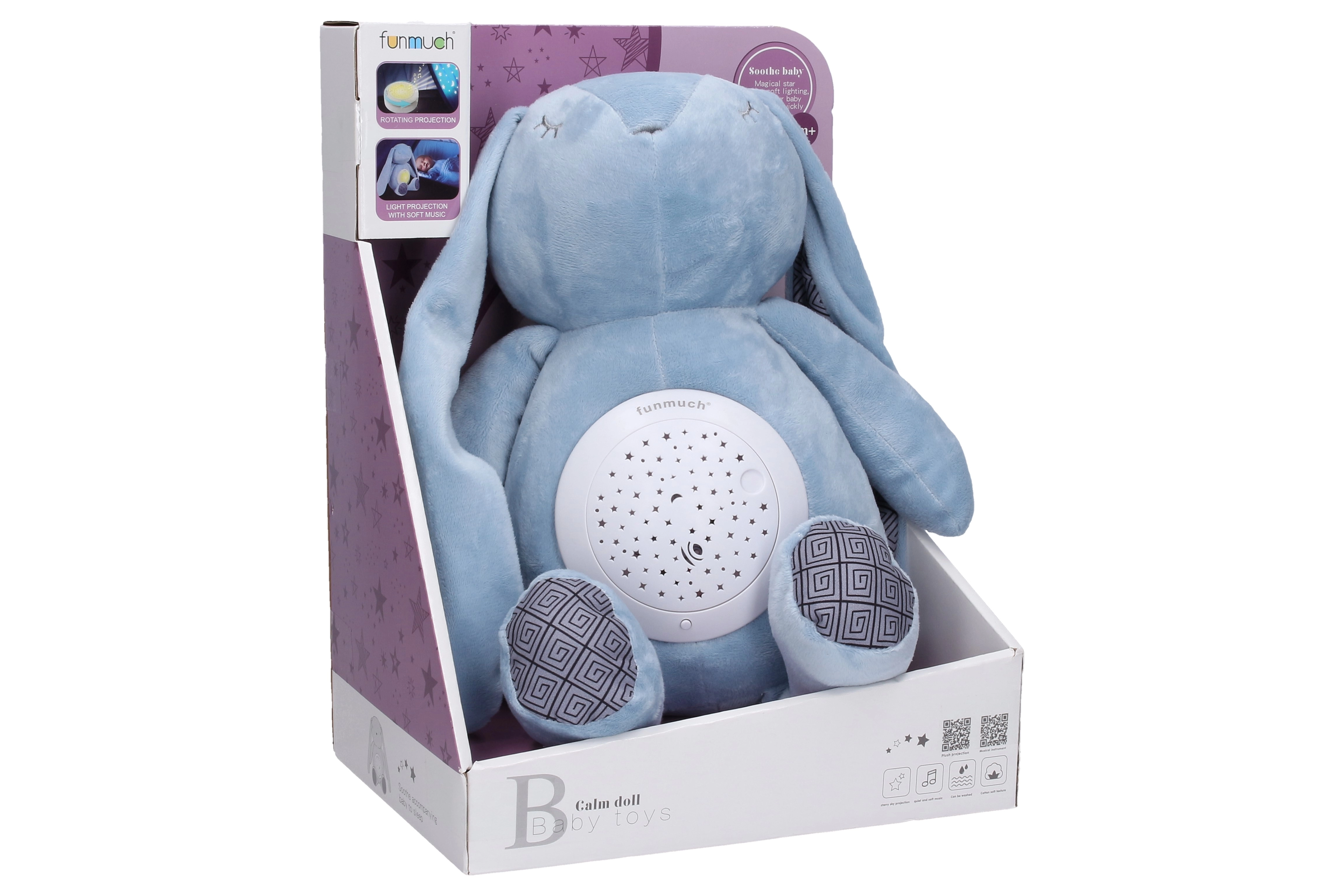 Der niedliche Einschlafhase mit Projektion hilft Kindern, ruhig einzuschlafen. Auf dem Bäuchlein hat er einen leuchtenden, sich drehenden Projektor, der zarte Lichtmuster projiziert und Wiegenlieder abspielt. Der Projektor lässt sich leicht herausnehmen, wird mit nur einer Taste bedient und läuft mit 3× AAA-Batterien (nicht enthalten).