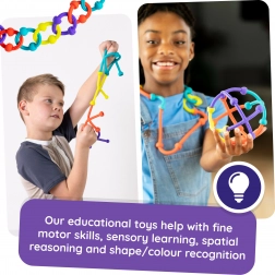 Der Silikon-Bausatz PLIP KIT verbindet spielerisch Flexibilität und einfaches Zusammenstecken. Die Teile aus lebensmittelechtem Silikon fühlen sich angenehm an, sind sicher und widerstandsfähig im Alltag. Kinder können vielfältige flexible Gebilde erschaffen, mit Formen experimentieren und die Hand-Auge-Koordination verbessern.