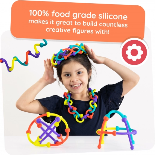 Silikon-Bausatz PLIP KIT von Fat Brain: 45 flexible Verbindungselemente aus sicherem, lebensmittelechtem Silikon. Fördert Kreativität und Feinmotorik.