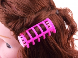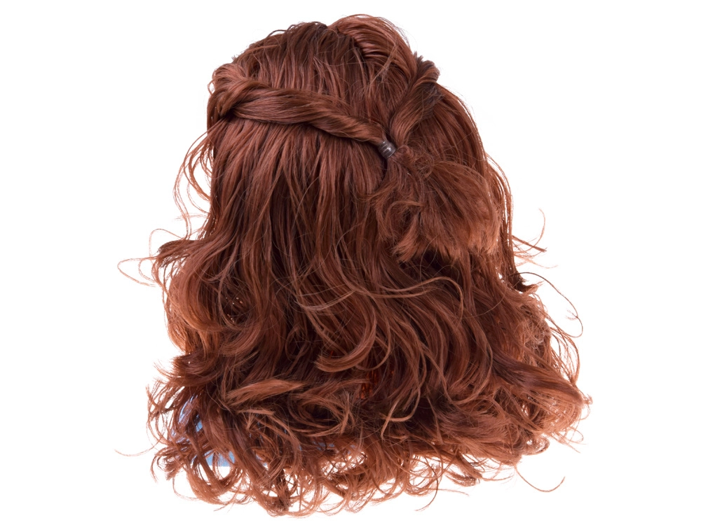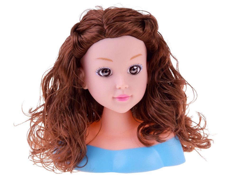 Dieser Frisierkopf mit langen, braunen, welligen Haaren und detailliertem Make-up ist ideal für kleine Stylistinnen und Stylisten. Die Haarsträhnen sind weich und flexibel, lassen sich leicht kämmen, aufdrehen und feststecken. Die stabile Kunststoffbasis hält den Kopf während des Stylings an Ort und Stelle.
