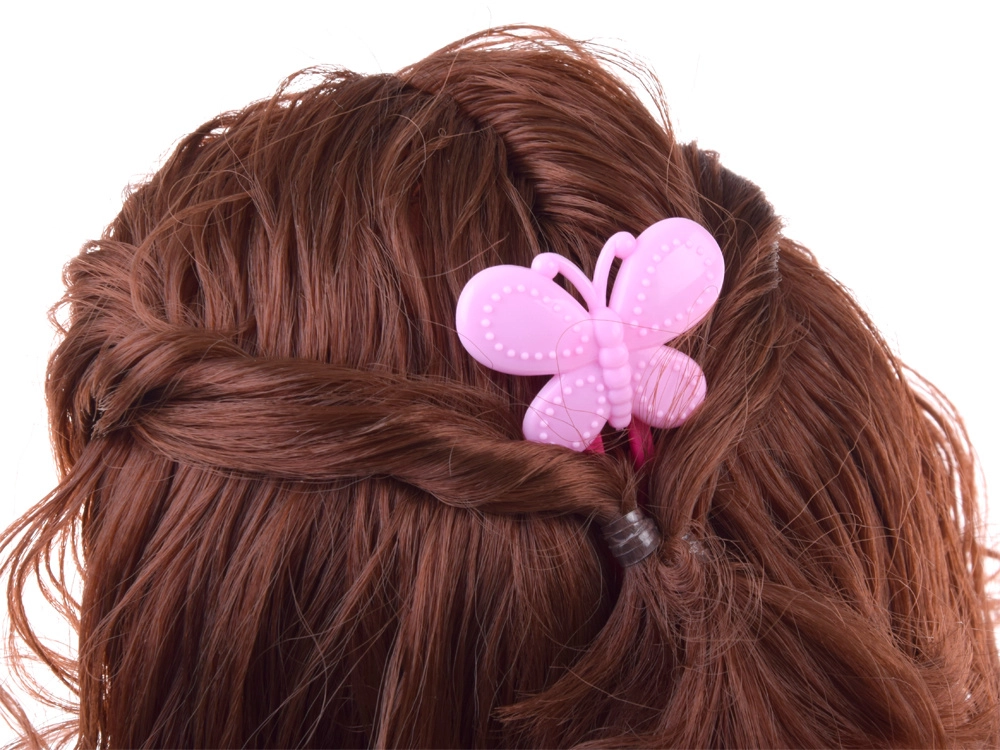 Die süße rosafarbene Spange in Schmetterlingsform hält Strähnen zuverlässig fest und verleiht fertigen Frisuren einen verspielten Akzent.