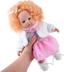 Puppe Alicja ist eine ideale Begleiterin für das tägliche Spiel und beruhigende Umarmungen. Sie hat einen weichen Textilkörper, flexible Gliedmaßen und einen Kopf mit detaillierten Gesichtszügen und blauen Augen. Die markante Mähne aus blonden Locken mit rosa Schleifchen verleiht der Puppe Charme und lädt zum Kämmen und Stylen ein.