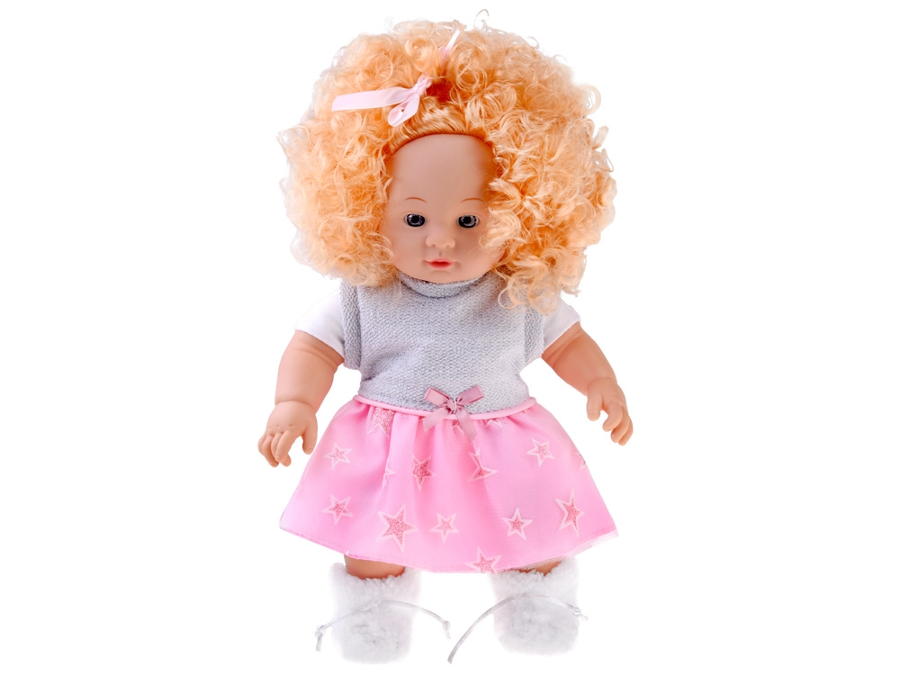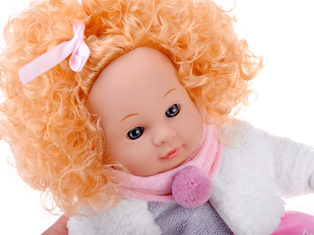 Inklusive Winter-Outfit: rosa-graues Kleidchen mit Sternchen, kuschelige weiße Jacke, rosa Schal mit Bommel und weiche Hausschuhe. Das integrierte Soundmodul spielt verschiedene kindliche Laute ab, wodurch das Spiel noch interaktiver und realistischer wird.