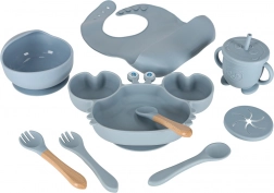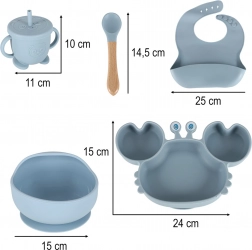 Dieses 9-teilige Silikon-Set deckt alle Bedürfnisse beim Essen ab: ein unterteilter Teller in Krabbenform für bessere Ordnung, Schüssel und Teller mit Saugnapf gegen Verrutschen, Becher mit zwei Deckeln und Trinkhalm, sicheres Besteck für kleine Hände sowie ein wasserabweisendes Lätzchen mit Tasche zum Auffangen von Krümeln.
