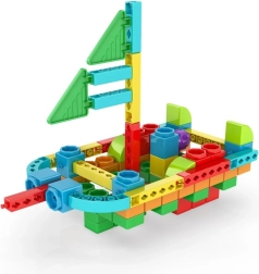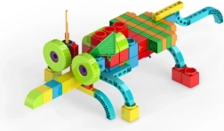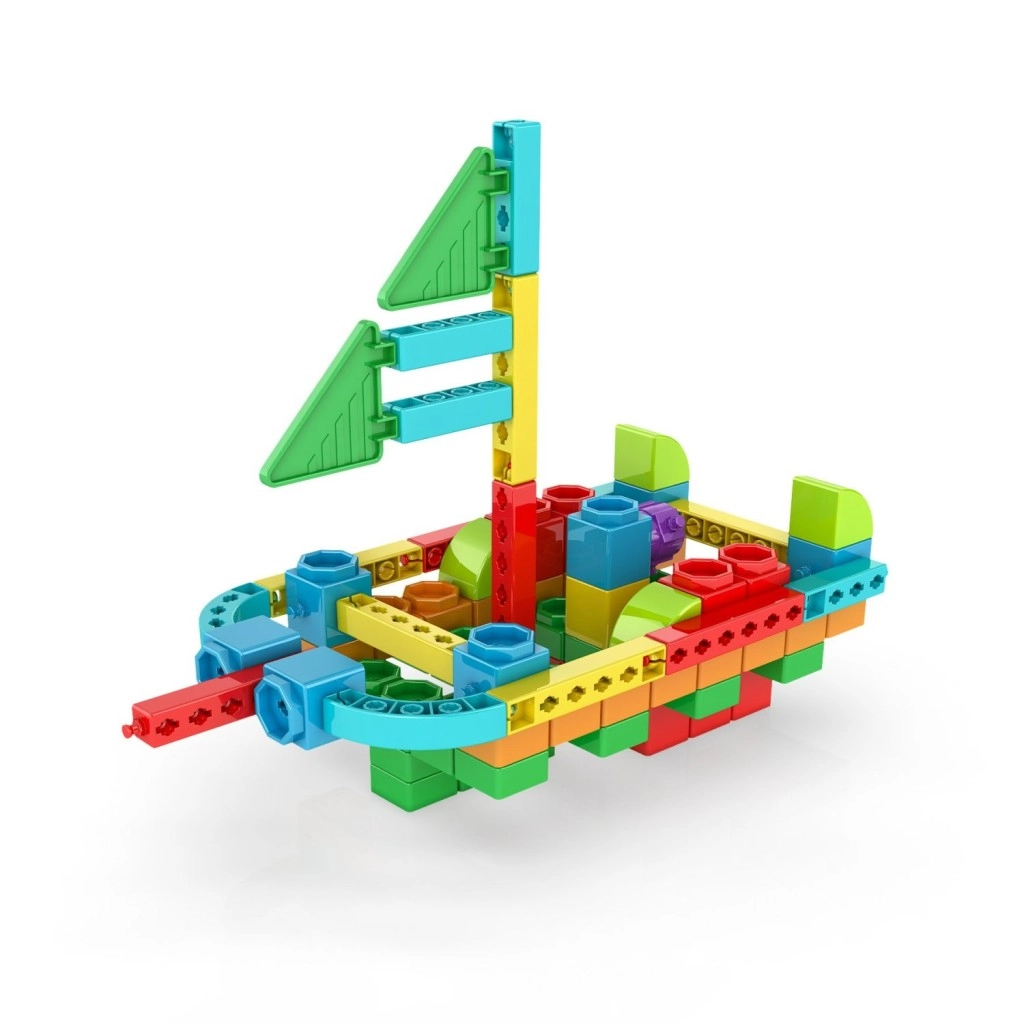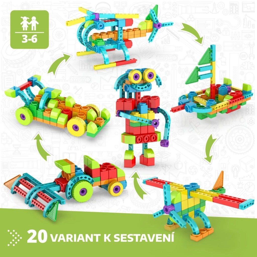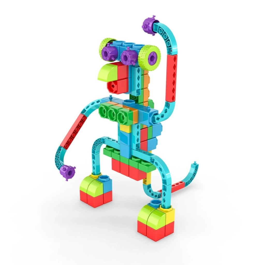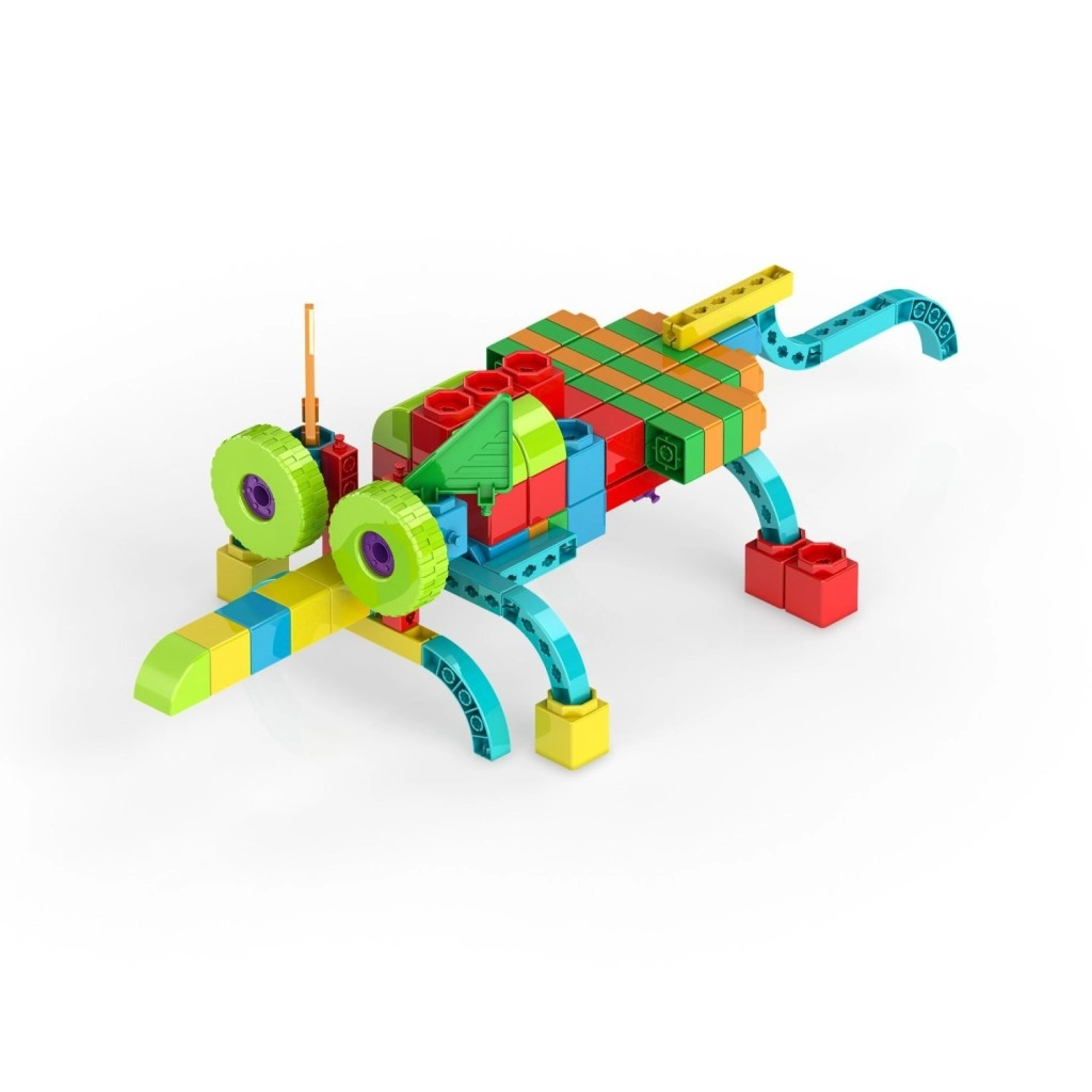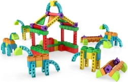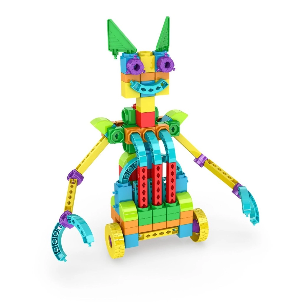 Ein großes Set aus farbigen Blöcken und Verbindern fördert Fantasie und Feinmotorik. Kinder bauen spielend Tiere, Figuren und Maschinen.
