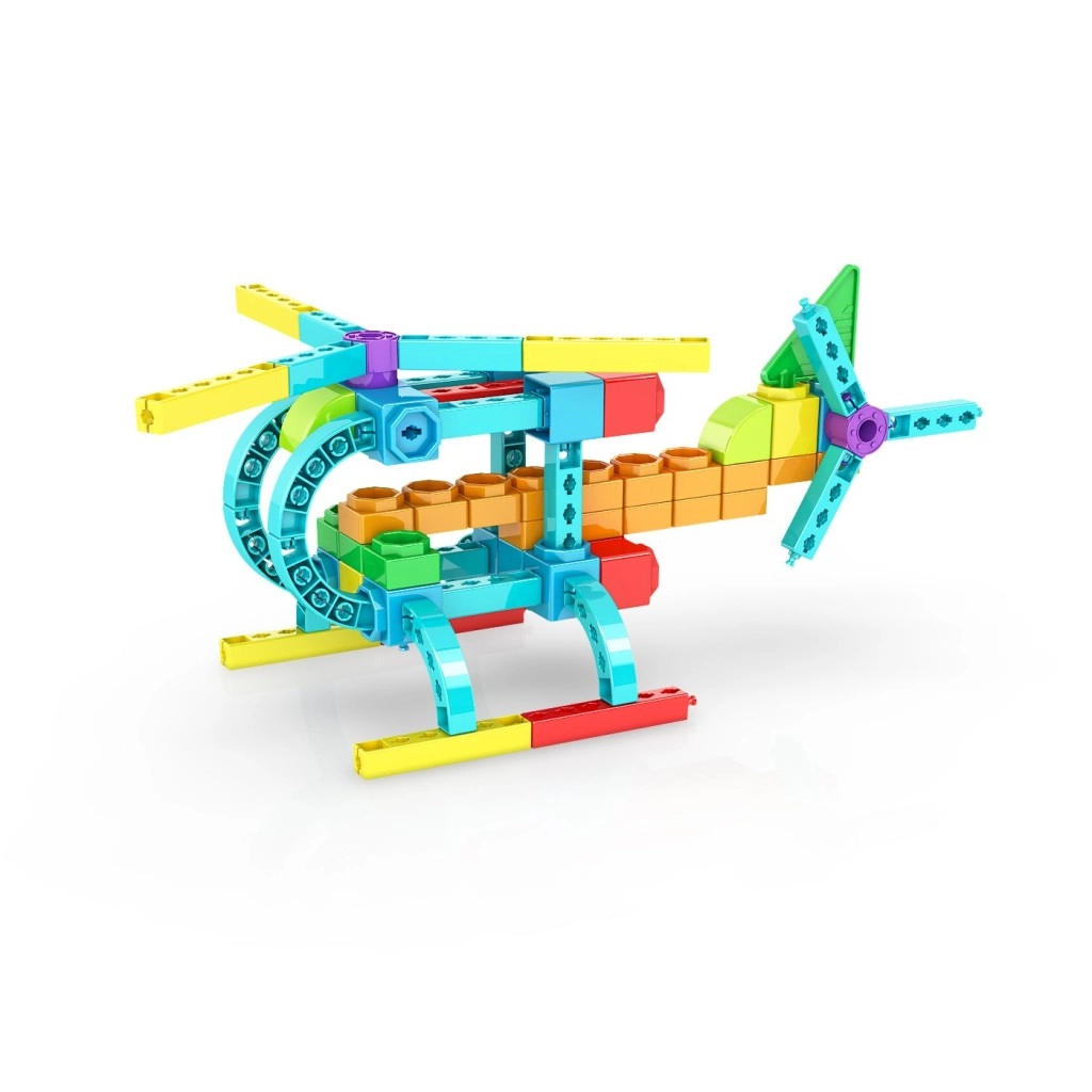 Bauen Sie Rennwagen, einen Hubschrauber und weitere Fahrzeuge mit beweglichen Teilen und Rädern – für noch mehr Spielspaß.