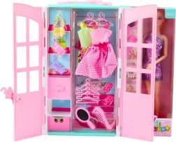 Dieses umfangreich ausgestattete Set begeistert jedes Kind, das Mode und Stil liebt. Der aufklappbare Kleiderschrank mit Regalen verbirgt bunte Kleidchen, praktische Kleiderbügel, passende Schuhe und Handtaschen. Dank Spiegel und Kamm ist die Puppe für jeden Anlass bereit. Das Spiel fördert Fantasie, Feinmotorik und den Sinn für Farb- und Stil-Kombinationen.