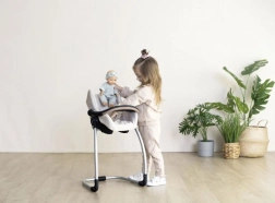 Dieses multifunktionale Puppenset kombiniert drei beliebte Funktionen in einem: einen Autositz für einfaches Tragen, einen Schaukelsitz bei Aufhängung am Gestell und einen stabilen hohen Hochstuhl nach dessen Drehung. Ideal für realistisches Spiel und die Förderung der kindlichen Fantasie.
