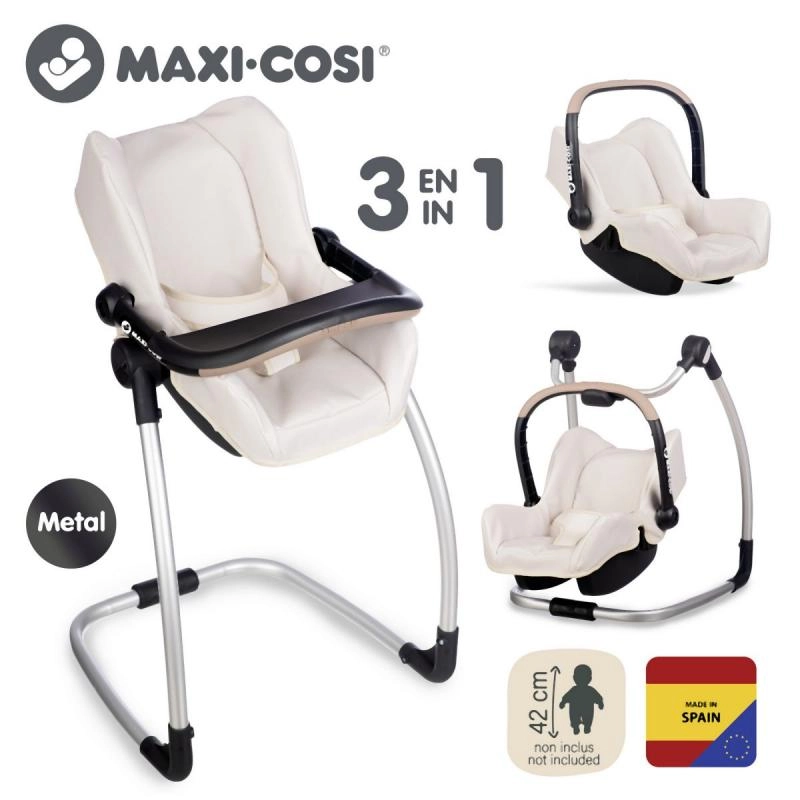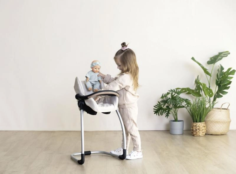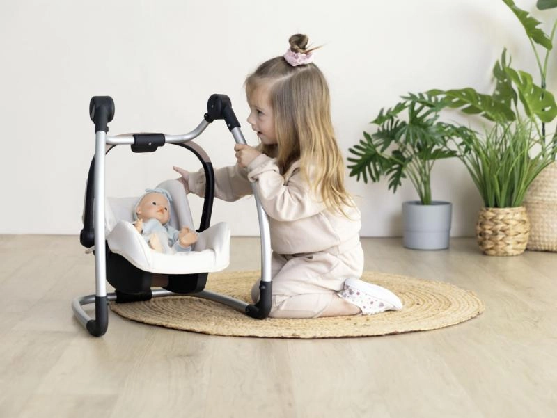 Praktisches 3-in-1-Set für Puppen, das als Autositz, Schaukel und hoher Hochstuhl dient. Lässt sich durch Drehen des Gestells leicht umwandeln, ist geeignet für Puppen bis 42 cm und begeistert mit modernem beigem Design.