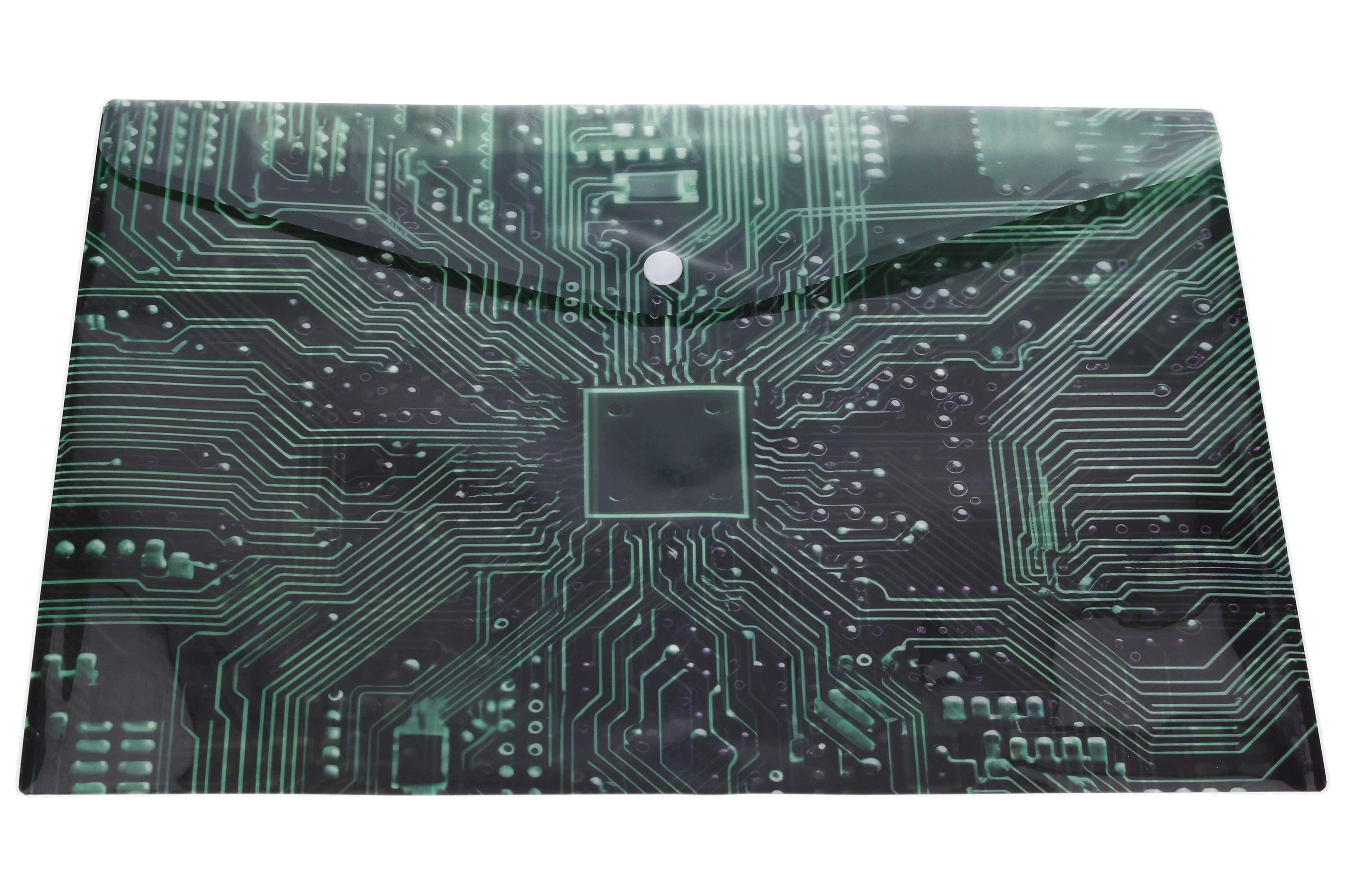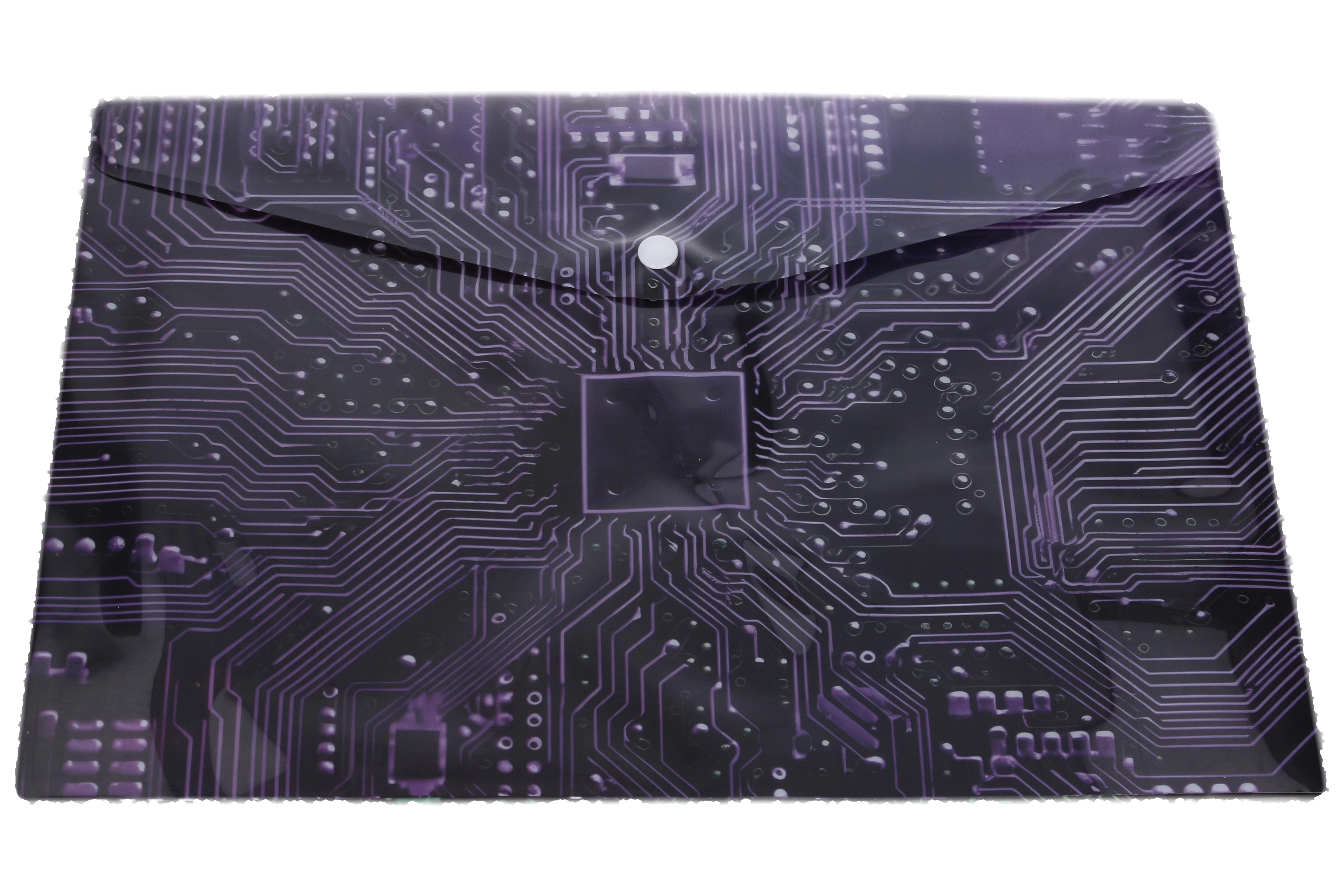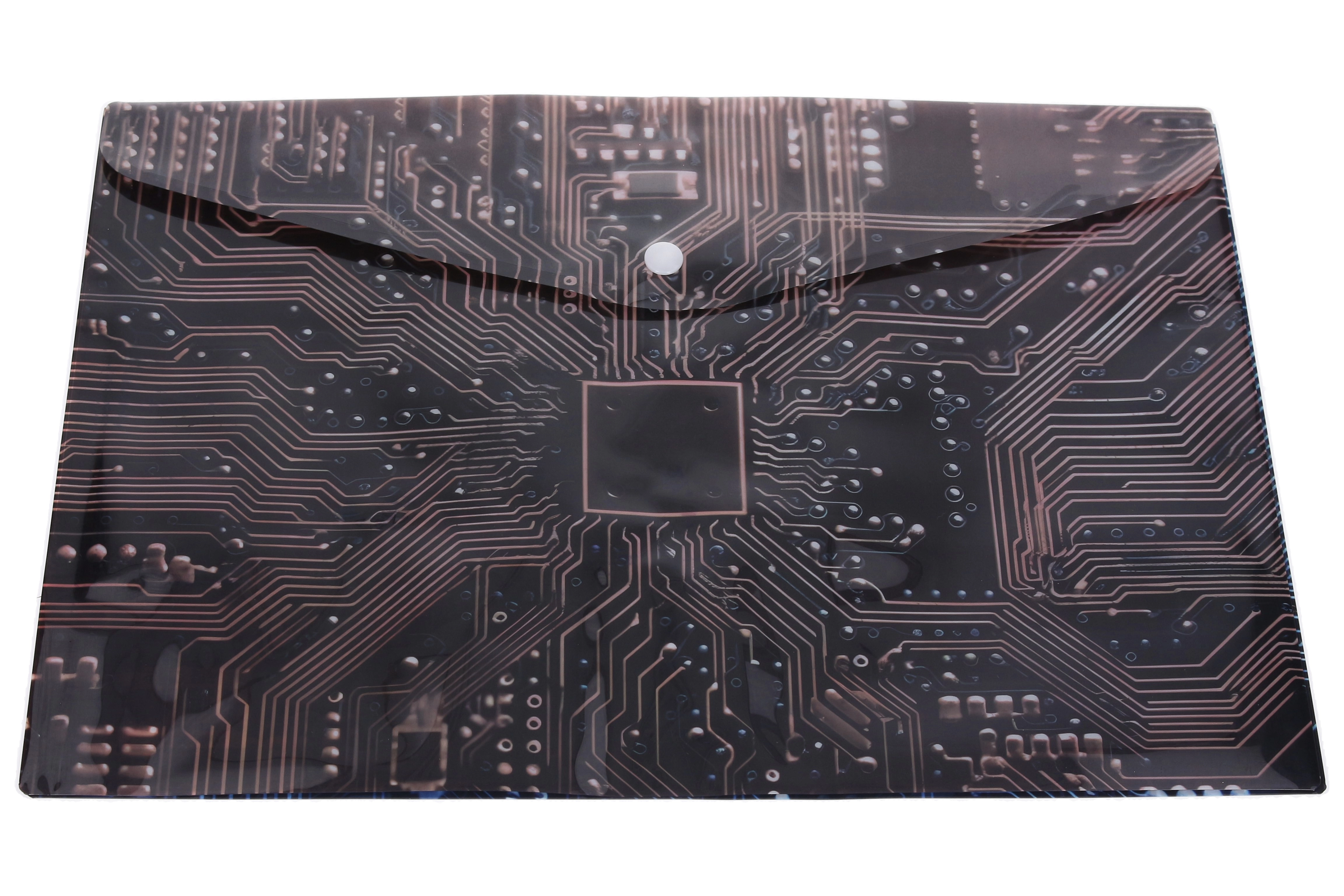 Stilvolle und praktische Dokumentenhülle schützt Ihre A4-Unterlagen vor Knicken und Staub. Dank des zuverlässigen Druckknopfverschlusses, des robusten Kunststoffs und des originellen Mainboard-/PCB-Motivs sind Ihre Dokumente stets sicher und übersichtlich verstaut. Erhältlich in 4 Farbvarianten.