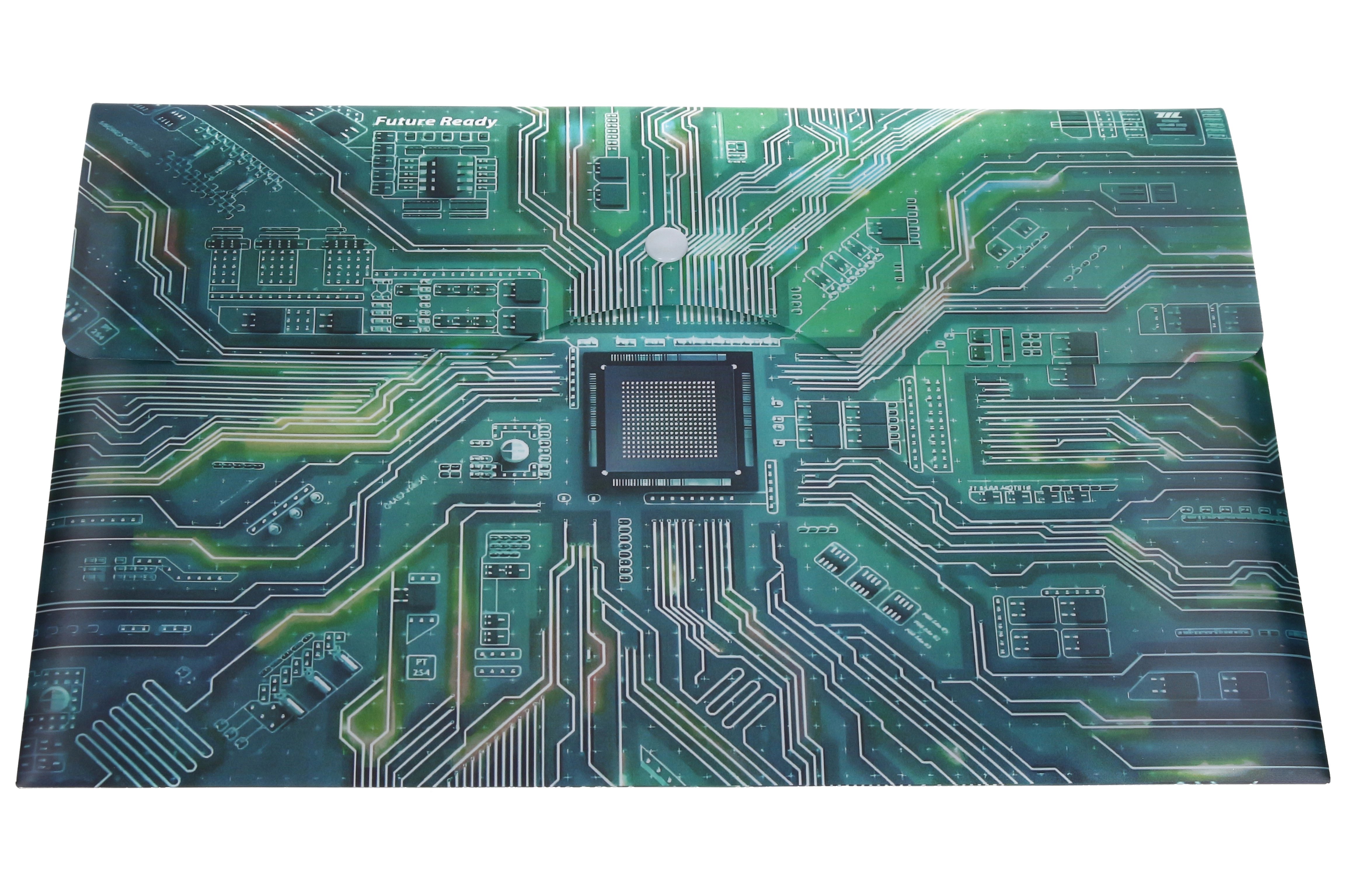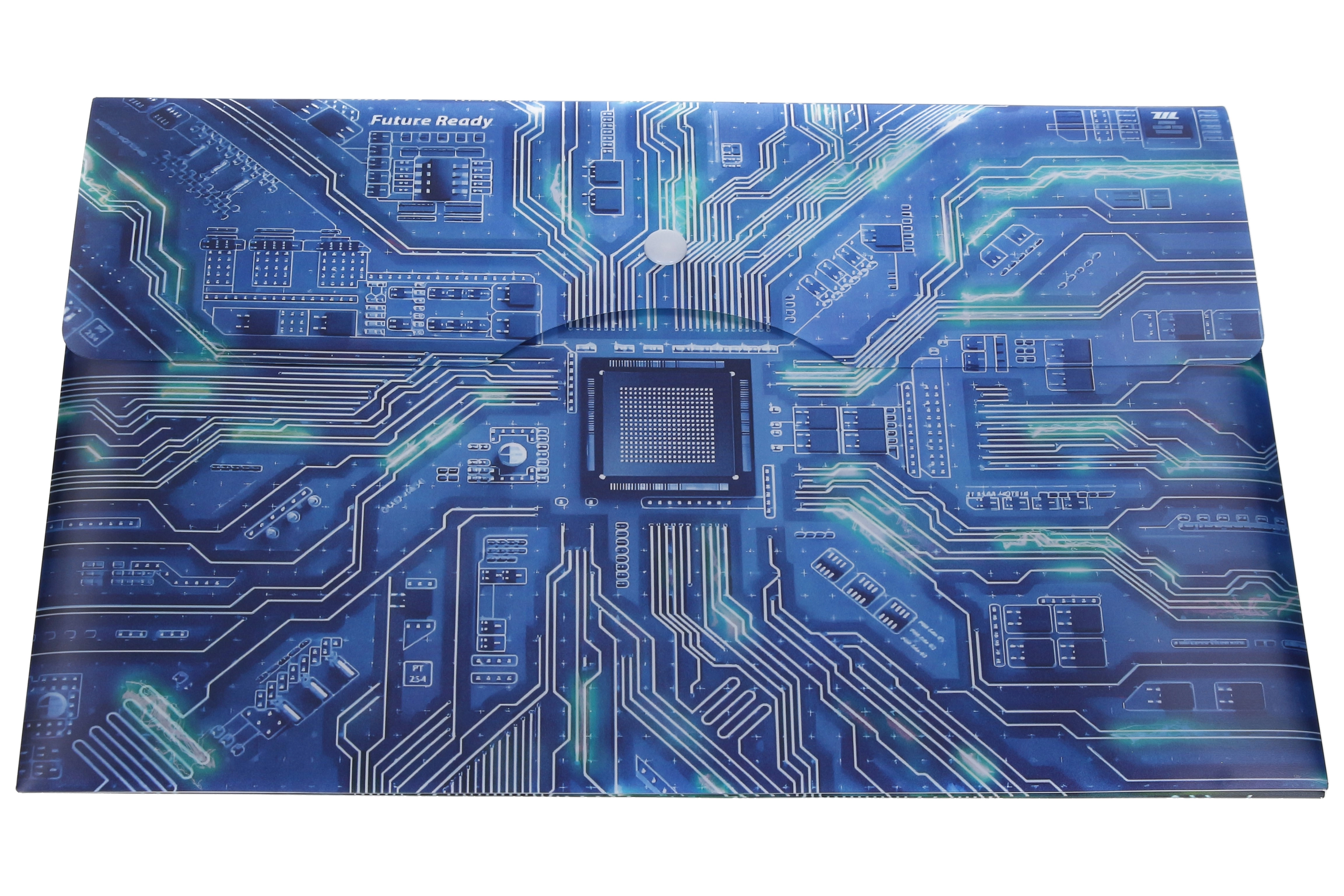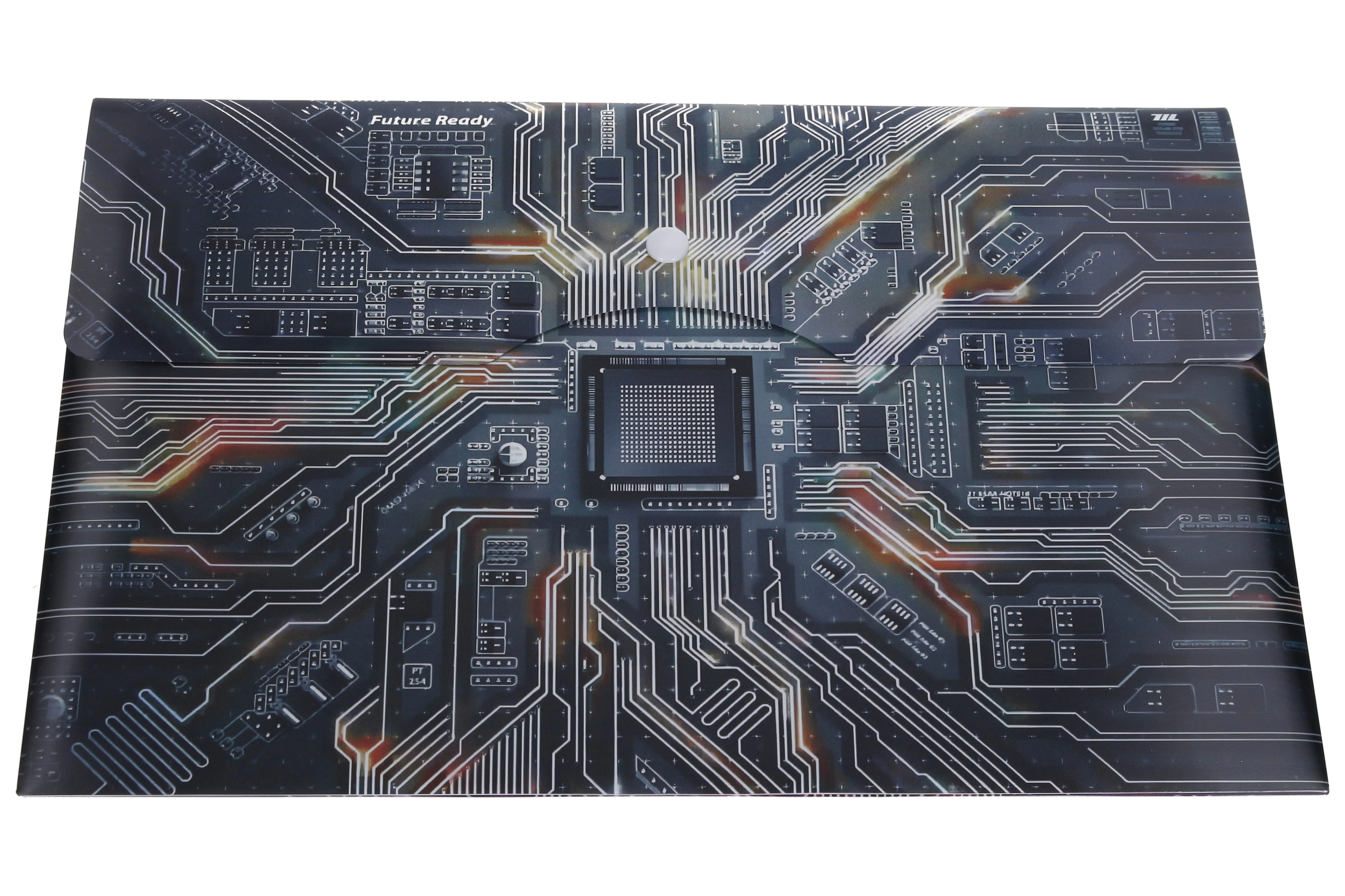 Bewahren Sie Ihre Papiere übersichtlich und sicher auf. Diese robuste Kunststoffmappe mit Hauptplatinen-Motiv und dem Schriftzug „Future Ready“ bietet die perfekte Kombination aus Funktionalität und modernem Design. Das A4+-Format fasst mühelos Standardblätter und etwas größere Materialien, während der zuverlässige Druckknopfverschluss ein unbeabsichtigtes Herausrutschen der Dokumente verhindert.