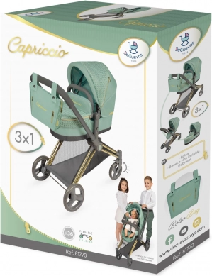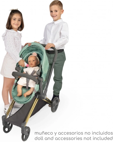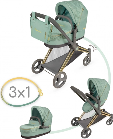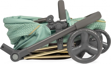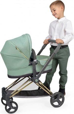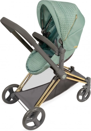 Dieser stylische Puppenwagen überzeugt durch die Kombination aus modernem mintgrünem Stoff und dekorativen Details einschließlich goldfarbener Elemente. Dank der durchdachten Konstruktion verwandeln Sie ihn im Nu von der Babywanne zur Sportversion und zurück. Der höhere Schiebegriff (73 cm) sorgt für komfortables Fahren auch für Vorschulkinder.